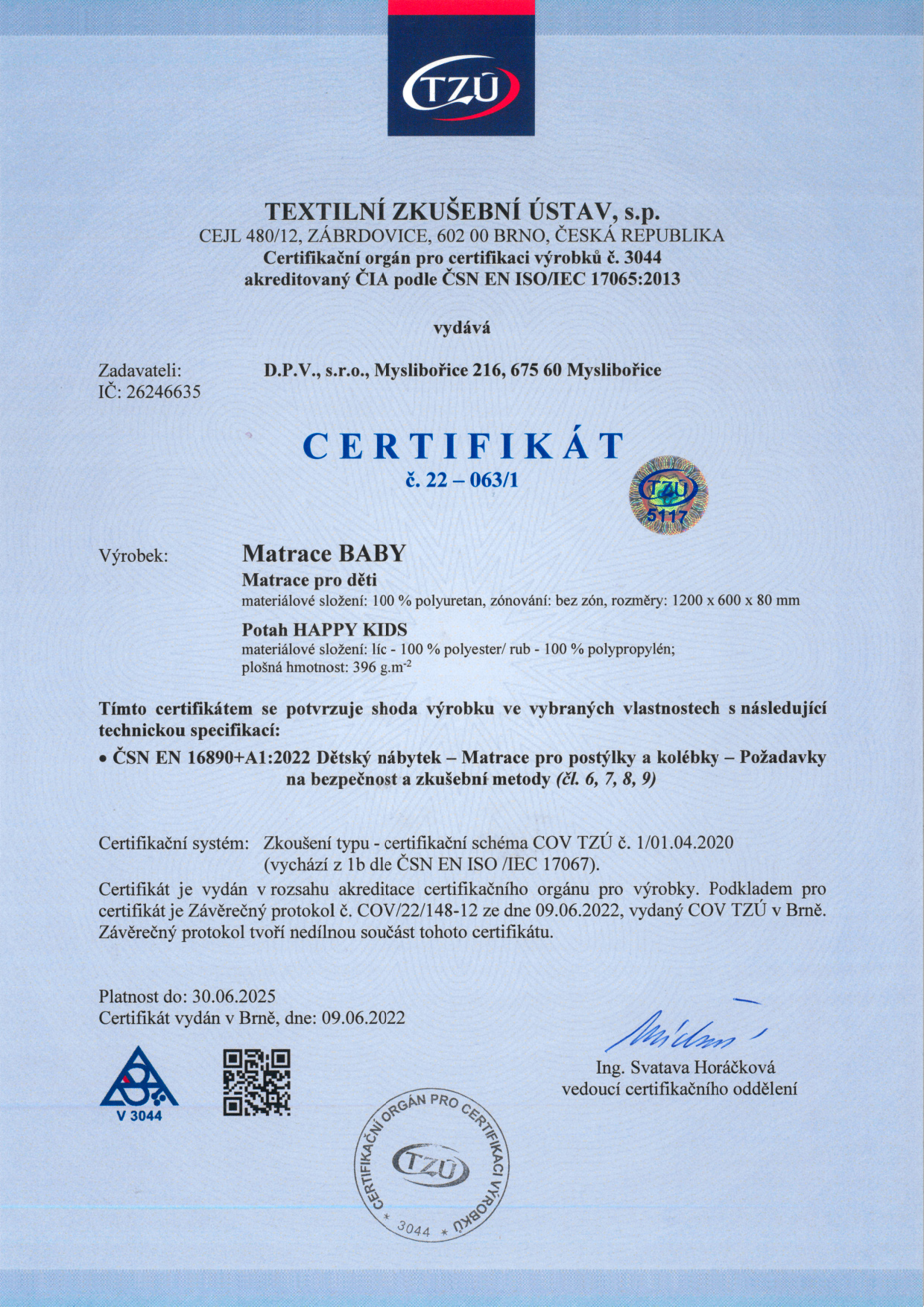 Vyhláška č. 84/2011 zb. Ministerstvá zdravotníctva o hygienických požiadavkách na hračky a výrobky pre deti vo veku do 3 rokov, v znení neskorších predpisov a osvedčuje sa, že materiály zodpovedajú hygienickým požiadavkám uvedenej špecifikácie, sú vhodné pre poťahy matracov a nepredstavujú zdravotné riziko.