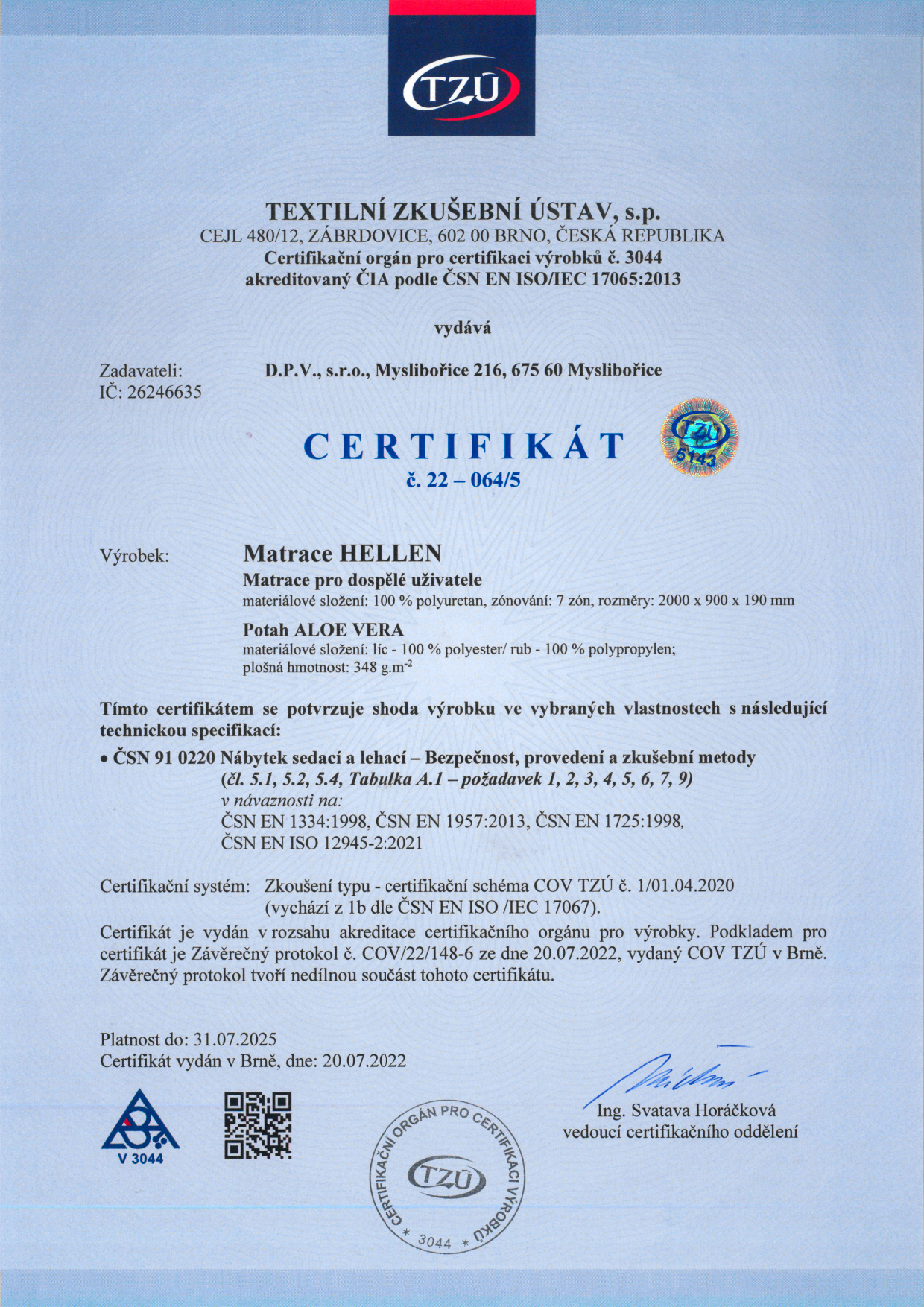 Metodické odporúčanie Štátneho zdravotného ústavu č. 1/2000 na posudzovanie výrobkov, ktoré prichádzajú do priameho styku s ľudským organizmom prostredníctvom kože, prípadne slizníc osvedčuje, že materiály zodpovedajú hygienickým požiadavkám uvedenej špecifikácie, sú vhodné na poťahy matracov a nepredstavujú zdravotné riziko.