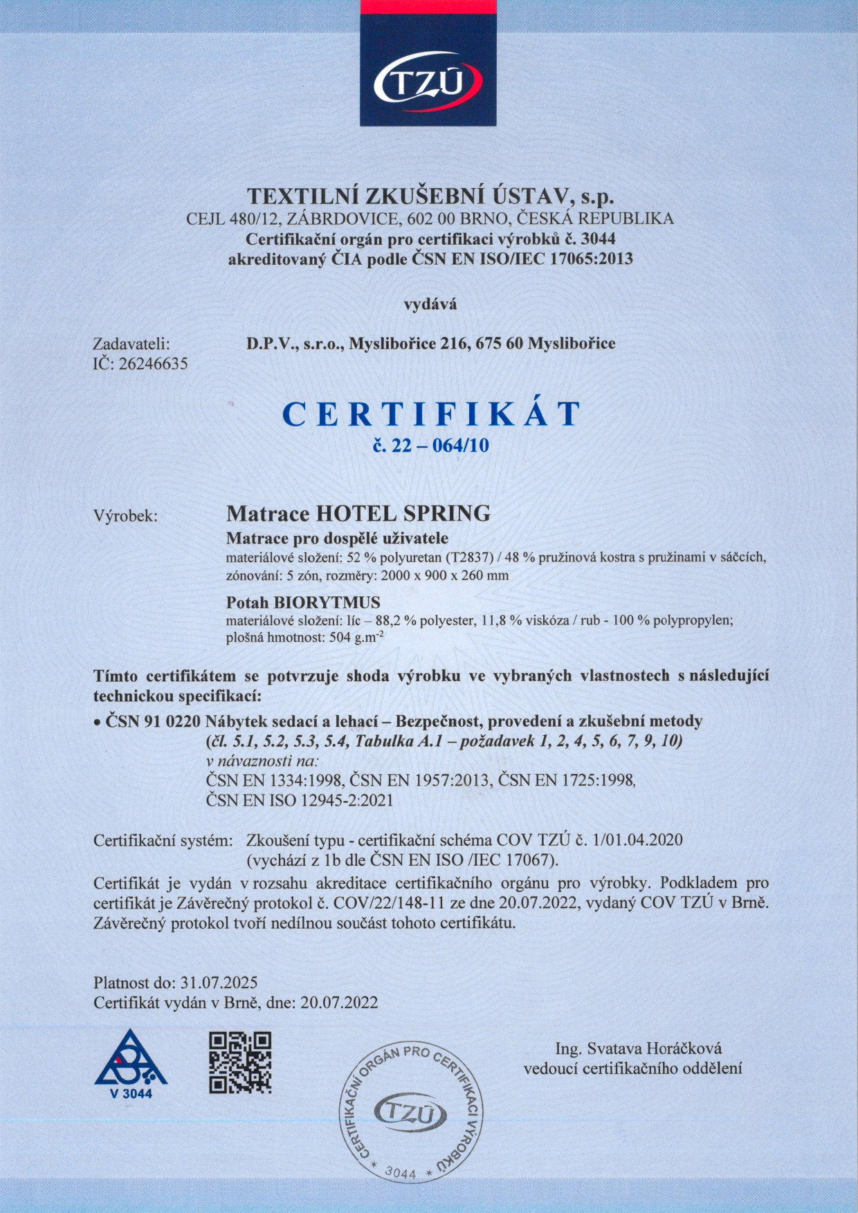 • Textilný Skúšobný Ústav – Certifikát č. 21-085